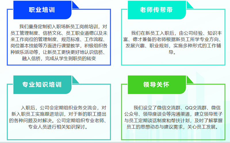 1、 vocational training. We are entering the workplace tailored pre job training of new employees, the staff management system, channel bridge culture, employee occupation moral and future work management system, work flow, work standards, basic skills of classroom teaching, organize all kinds of recreational activities actively, so that new employees faster and better understanding of the letter, the letter into the bridge the bridge, completed the transition from student to staff.
